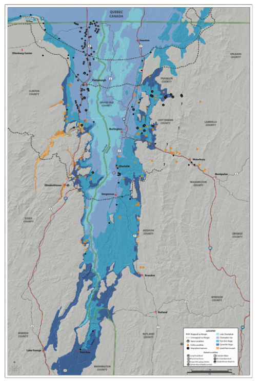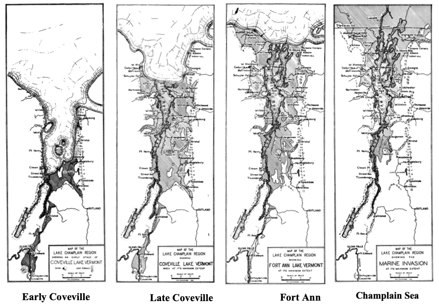 - On page 11 of the Wright report it is stated that the Champlain Sea limit in the Charlotte area is at an elevation of approximately 295 feet(90 m) (which is close to the elevation of his deformation exposure on the LaPlatte near Spear Street), and that, based on soil cores obtained from the Winooski area, the approximate 100 meter drop of water levels from Lake Vermont to Champlain Sea was sudden. The significance of both of these observations relative to the interpretations given here is obvious. The magnitude and suddenness of the change from Lake Vermont to the Champlain Sea is here believed to have been a significant trigger for further ice margin destabilization by calving as a “Glacial Dynamic.”.16The fact that the Champlain lobe calving was associated with multiple times of water level lowering, the first from Coveville to Fort Ann and the second from Fort Ann to Champlain Sea , makes it difficult to definitively establish whether or not the calving recession of the Champlain lobe reached a “trigger point” beyond which the lobe was unable to recover. Further, based on the evidence suggesting that the ice margin in the Missisquoi Basin remained and continued to recede and was still present in later Champlain Sea time when sea level lowered owing to isostatic uplift, suggests that continued recession (including by calving) may have been a response to ongoing water level lowering.