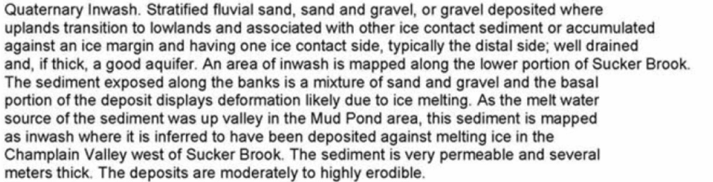 As discussed below, this deposit and an associated deposit further north on Sucker Brook at a higher elevation are here interpreted as kame delta deposits associated with the Coveville and Fort Ann levels related to the calving ice margin in the “Middlebury Bench” area, and the drainage of Lake Mansfield prior to the opening of the Winooski Basin for the invasion of Coveville and Fort Ann waters into the Winooski Basin. While the authors did not suggest calving, this description is included here as part of this review of previous work which is here regarded as supporting calving. Sucker Brook lies along the eastern margin of a small physiographic re-entrant which the evidence below indicates was occupied by a calving ice stream as a small appendage of the Winooski ice tongue. Springston and DeSimone’s mapping fits with and supports this interpretation.