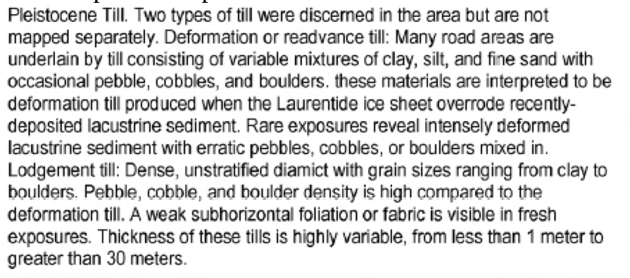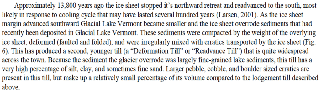 - Springston and Wright likewise recognized a bouldery silt-clay material in the Charlotte area, just north of Middlebury, leading to their suggestion of a climatically significant readvance related to a “Deformation or Readvance Till” as distinct from a lodgement till. Unfortunately, they did not depict the distribution of their Deformation Till locations on their map.
