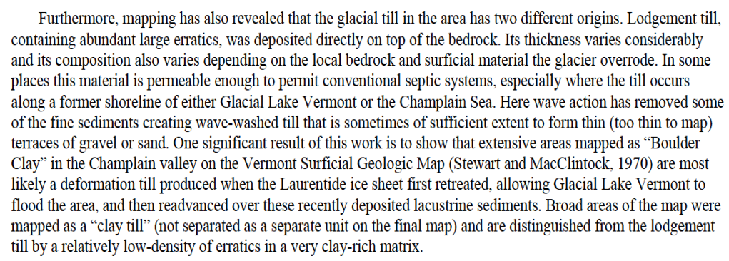 Stewart and MacClintock refer to what they describe as a virtual absence of till in large portions of the Champlain lowland with lake clays in many places directly lying on bedrock, suggesting to them that the ice sheet may have been calving during both its advance and retreat. This is an intriguing thought, which may bear on the origin and formation of glacial till in Vermont, perhaps with much of it forming at a late time in glaciation. However, this is a topic far beyond the scope of the VCGI investigation here and as well is unrelated to the calving issue.