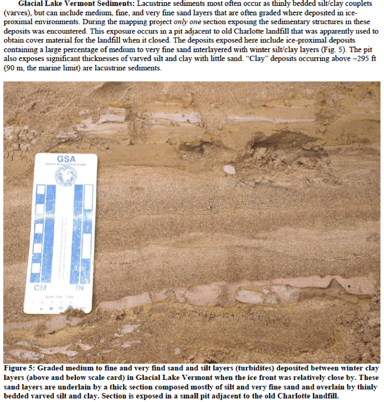 Fast forwarding, also as discussed below, I subsequently reviewed the reports of Springston and Wright in the Charlotte area. These authors likewise identified stratigraphic and structural features associated with both interbedded silt and clay soils and sandy soils , which they interpreted as a readvance. Again, I initially suspected that this evidence may instead be related to calving, which likewise was not recognized or considered by the authors as an alternative hypothesis explanation for such deposits. Further, at least some of these deposits are within the Champlain Sea level.