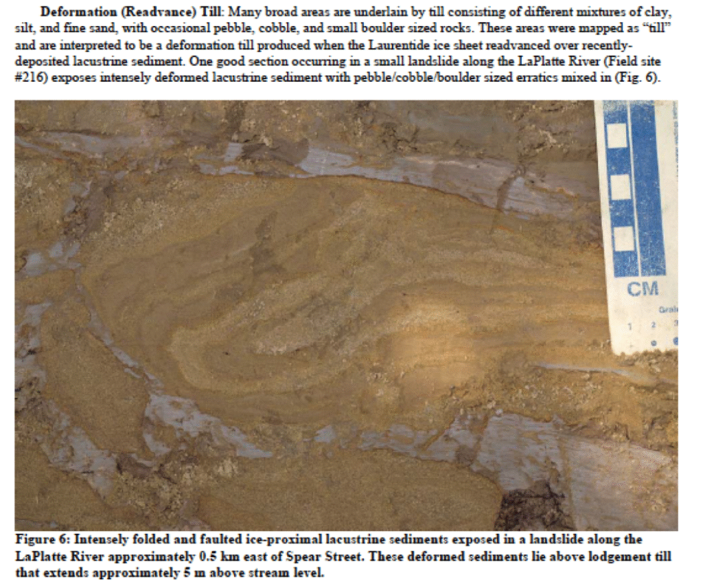 - As discussed in the literature review above, an exposure reported by Wright in his Charlotte report along the lower LaPlatte River(#6), which he interprets as indicative of a readvance associated with Lake Vermont, is here believed to be in the Champlain Sea delta, and is compatible with an oscillating calving ice margin or a readvance, or both, associated with T8 time.