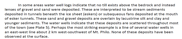 - P 8: On the east side of Chipman Hill(in Middlebury) are ” kame gravels with sandwiched till lenses.” (This specific area and deposit are discussed further below in the section on VCGI results, as part of the evidence identifying and delineating a calving ice margin.)