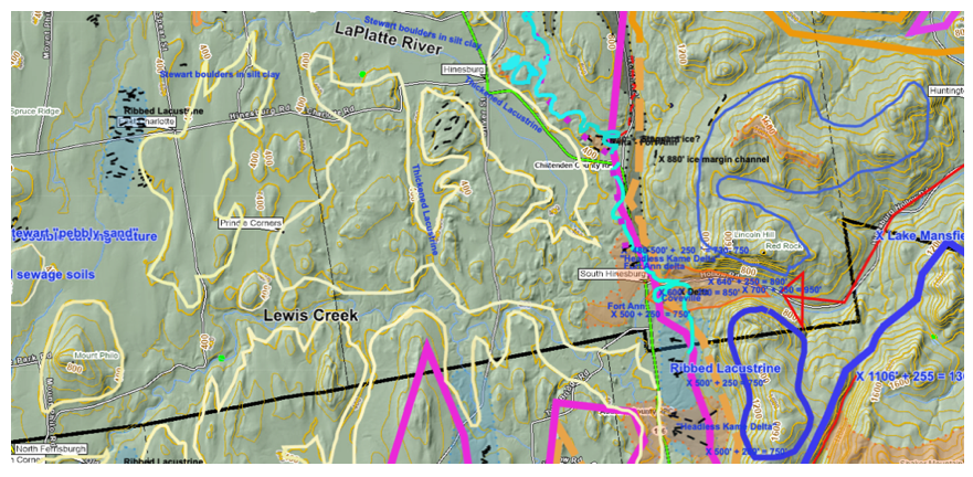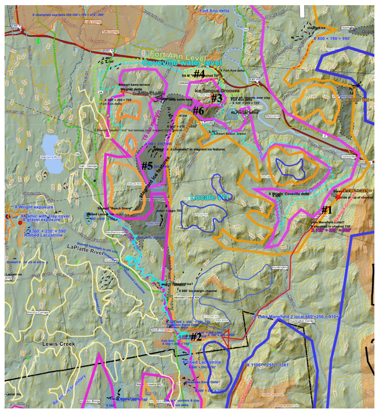 - Multiple Headless Deltas at the Fort Ann level and Ribbed Lacustrine deposits are mapped on VCGI south of the South Hinesburg delta complex, at and just below the head of the LaPlatte Basin. These formed at the Fort Ann level as part of the receding calving ice margin, representing the development of calving in late T6 time. These deposits, which are too small and close together to be individually shown are located at position #2.