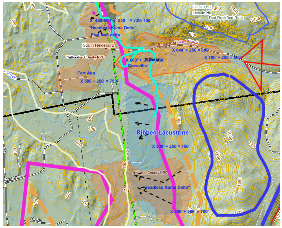 The T4-T5-T6 step down ice margins are marked by blue, orange, and maroon lines. The pale yellow lines trace the 400 foot(122 m) contour, to give a better sense of physiography in the area. This gives a sense of the LaPlatte Basin, and also the small basin described above in conjunction with the features associated with Oak Hill and Sucker Brook. The bright neon blue line marks the 520 foot(158 m) contour, which is just above the Fort Ann level. The Fort Ann delta at South Hinesburg is at a local elevation of about 500 feet (152 m), which likewise corresponds with the elevation of the above described calving ice margin features in the area.