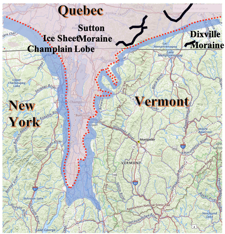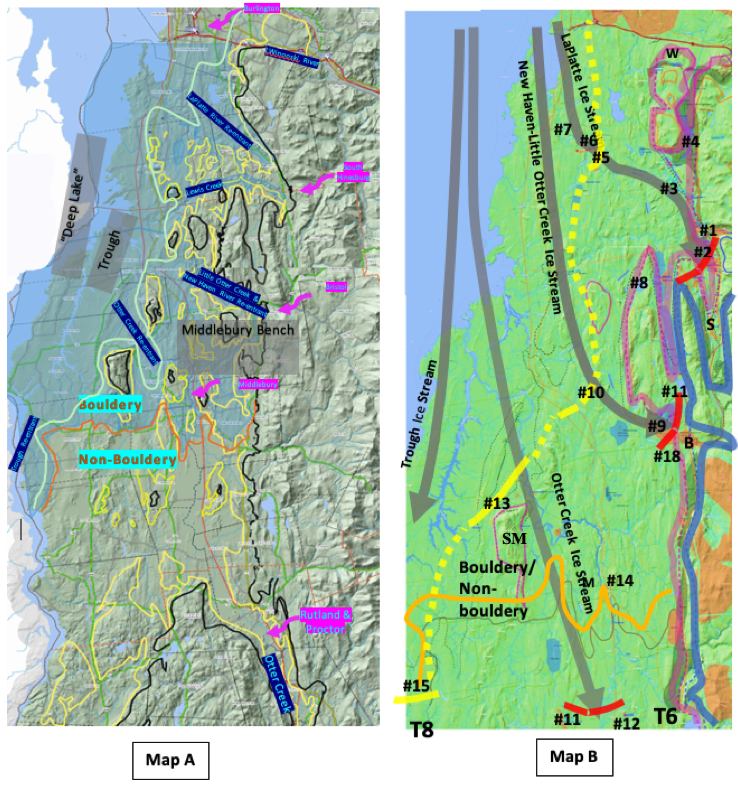 - As can be seen on the above map B, the southward projection of the bouldery soils is close to and essentially marks the Champlain Sea at the marine limit, including for both the Otter Creek and Trough ice streams.