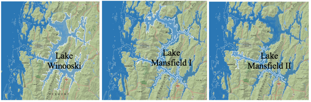 Water bodies in the interior uplands of the foothills have been recognized and delineated in different ways by previous investigators, as for example by Stewart and MacClintock(1969) and Wagner(1972), and were more substantially delineated by Springston et al, 2020),41 Springston, G., Wright, S. and Van Hoesen, J.(2020) Major glacial lakes and the Champlain Sea, Vermont, https://geodata.vermont.gov/datasets/VTANR::glacial-lakes-and-the-champlain-sea/explore?location=43.814720%2C-72.617800%2C7.61 as depicted by the maps below, showing the footprints of three levels for their Lakes Winooski, Mansfield I, and Mansfield II as indicated by the highlighted strandlines. These maps are presented here to give a sense of the close relationship between the receding ice sheet and proglacial water bodies. Lakes Winooski is regarded here as being associated with the T4 ice margin and Lakes Mansfield 1 and 2 with the T5 and T6 ice margins. These water bodies are part of the deglacial history associated with the step-down T4-T6 ice margin recession. Not shown are the myriad small, local proglacial water bodies that also developed long this margin. Although I (Wagner,1972) attempted to delineate such local water bodies, a definitive mapping of these has not been done.