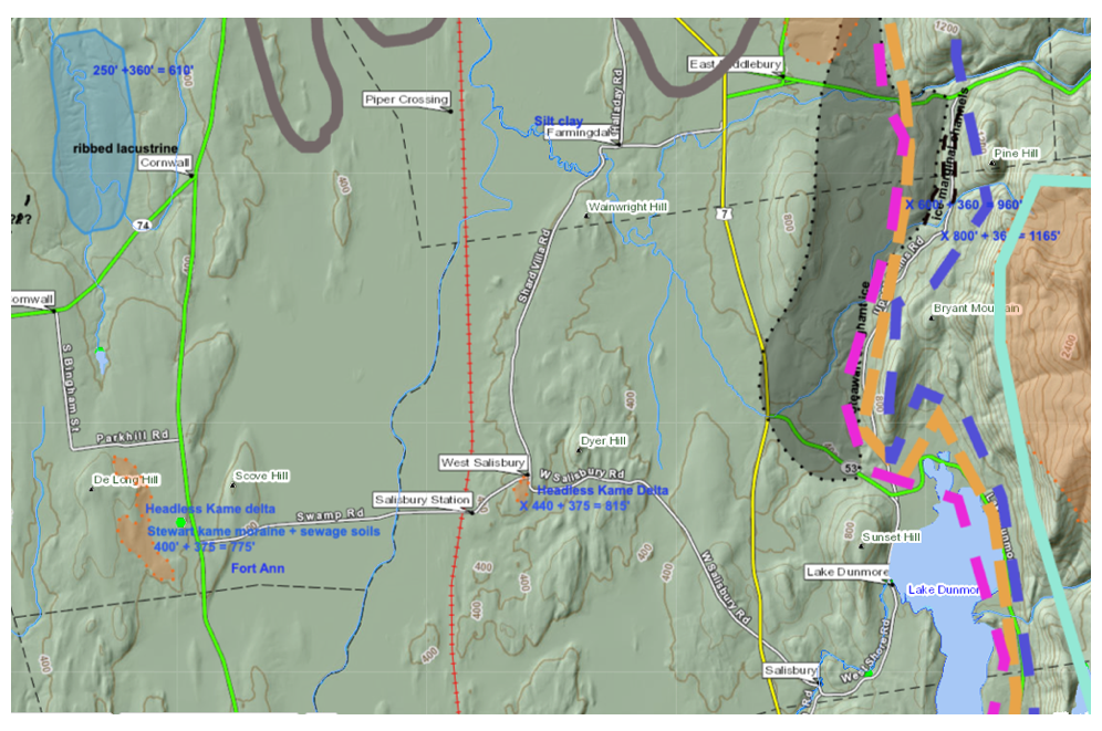The deposit along DeLong Hill is identified on the State surficial map as “kame moraine” Similarly to the east, at West Salisbury, is a deposit identified on the State map as “Lake Sand.” Both the Delong Hill and West Salisbury deposits are at the Fort Ann level, and are here interpreted as “Headless Kame Deltas,” signifying that their formation does not correspond with any present-day drainage, but likely were related to and associated with the Otter Creek ice stream at the grounding line of the calving ice margin. These deposits likewise are indicated on the soil sewage favorability tab on VCGI as more granular soils. LiDAR imagery does not show kamic topography but instead suggests low, relatively subtle topographic rises. These rises are marked by mining excavations, confirming the granular nature of the soils. In addition, LiDAR imagery shows curvilinear features which do not appear to be associated with human activity such as agricultural drainage controls. These approximately follow the topography and may be grounding line marks.