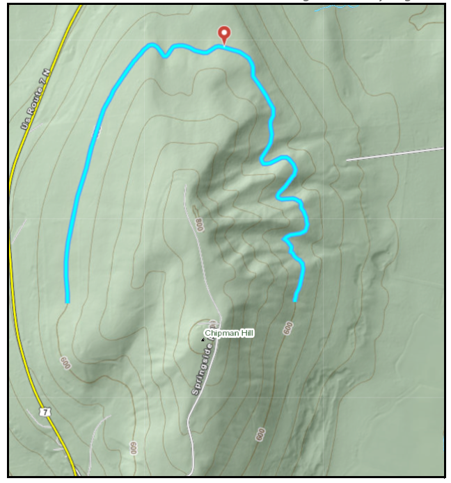The contour for the 600 foot(183 m)(local) elevation, which is close to the Fort Ann level, is partially highlighted. The explanation for the scalloping is uncertain but may represent subaqueous land terrain instability failures caused by erosion at the Fort Ann level, as described in the glaciology literature for present day grounding lines. Interestingly, if the scalloping was indeed caused by slumping, then it is notable that no corresponding debris pile at the base of the hillside is evident, which may be attributable to the presence of ice at the time of slope failure. Also at the base of the eastern slope of Chipman Hill, just below the 600 foot(183 m) contour are stagnant ice deposits, as reported by Calkin, with “till sandwich deposits.”