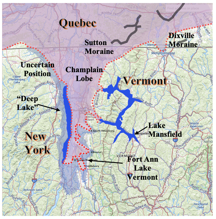 In my opinion the Chapman and Parent and Occhietti depictions of the ice margin are based on a paradigmic model preconception, but not actual documentation of the ice margin at these northerly positions. Part of Dave’s argument is based on surface ice gradient estimates which he contends indicate it was very difficult for the Laurentide ice sheet to sustain such a long convex lobe. I concur, but believe that this ice lobe was remnant ice remaining during ice margin recession. Further, I believe that the Fort Ann Corridor that extended northward on the New York side of the basin, related to the Deep Lake, served to open the New York portion of the basin much more substantially, in effect like a fault line resulting in very different deglacial histories on the New York versus Vermont sides. Further, I believe that in fact the lobate ice margin as now drawn here was unstainable, which helps to explain the evidence indicating the rapid recession of the ice margin, essentially the collapse of the Champlain lobe.