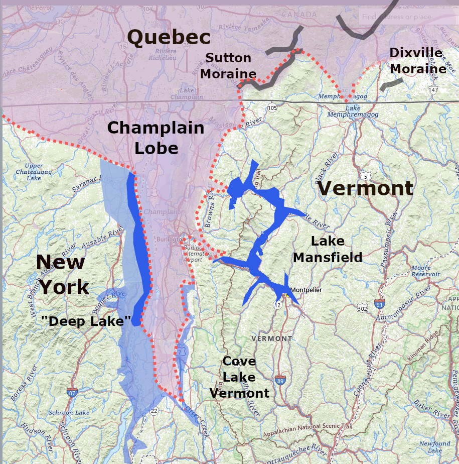 - As part of the recessional history leading up to T6 time, are: a) the successive “Disconnections” and en masse stagnations of ice in three portions of the Connecticut Basin, in T3- T4 time; b) the linkage of the T4 margin with the White Mountain Moraine System, as a readvance; c) the major stagnant ice T3 and T4 deposits at Bennington and Rutland, respectively, identified as moraines by Stewart and MacClintock, including evidence consistent with a T3/T4 readvance at these locations; d) the progressive development of Lake Winooski iin T4 time in the Lamoille and Winooski Basins as mapped by Wright et al, with VCGI evidence indicating the development of a “Disaggregated” hybrid margin on the eastern perimeter of Lake Winooski and Disconnection of ice masses in deep basins on the western margin of Lake Winooski; e) the recession of the T4 -T6 ice margins in the upland interior allowing for the expansion of Lake Winooski, followed by its lowering to Lake Mansfield; f) the parallel recession of the T3 -T6 margins in the Memphremagog Basin, leading to a small remnant lobe tip in the Memphremagog Basin in T6 time associated with proglacial Lake Memphremagog; g) Drainage Line evidence associated with drainage along ice margins in T4 -T6 time, providing links between the Memphremagog Basin to the Lamoille and Winooski Basins, to the main Champlain Basin, as part of the progressive step-down ice margin and proglacial lake history; h) the development of Ice Tongue Grooves at the mouths of the Otter Creek, Winooski, and Lamoille Basins in T4-T6 time, and the formation of the Shattuck Mountain Potholes.