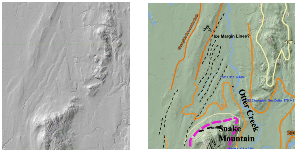 “Ice Margin Lines” northwest of Snake Mountain are of particular note. The following are screen shots of the area, taken from VCGI, on the left with the LiDAR tab turned on but no markings, and on the right from the VCGI Project Sheet: