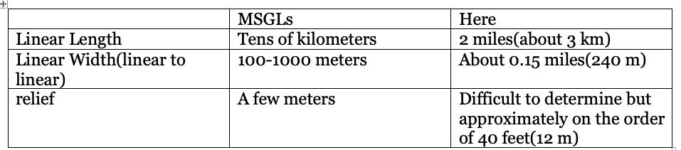 The Ice Margin Lines at this location resemble and may be “Mega-scale Lineations”(MSGLs) or “Grounding Zone Wedges. ” As described above, MSGLs are elongate linear elements on generally flat topography associated with fast moving ice streams at calving ice margins, with the linears thought to be impressions caused by the weight of fast moving ice in ice streams on underlying soft sediment, typically soft, deformable till. Thus, MSGLs form at the grounding line of calving ice margins, oriented parallel with ice streaming.
