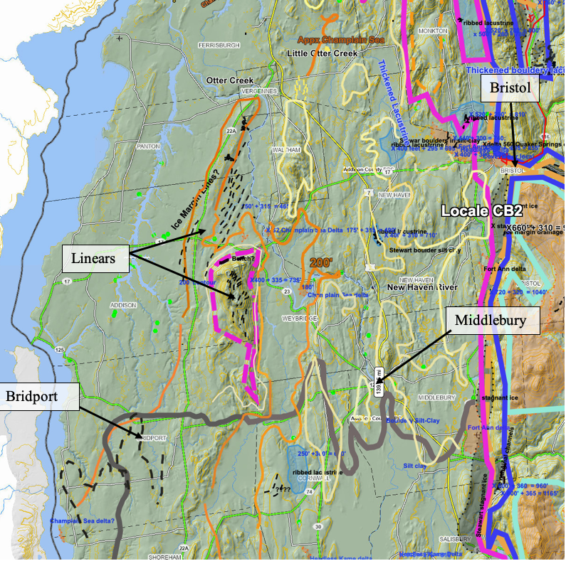 It is here suggested that linears and the Bridport “readvance” originally proposed by Connally may correspond with a calving ice margin oscillation or readvance in T8 time, similar to the evidence noted above in the Middlebury and Charlotte areas. The State surficial map does not associate the bouldery fine grained material on the basin floor in the area as marine or lacustrine, merely as “boulders in clay” but the elevation is below the marine limit.