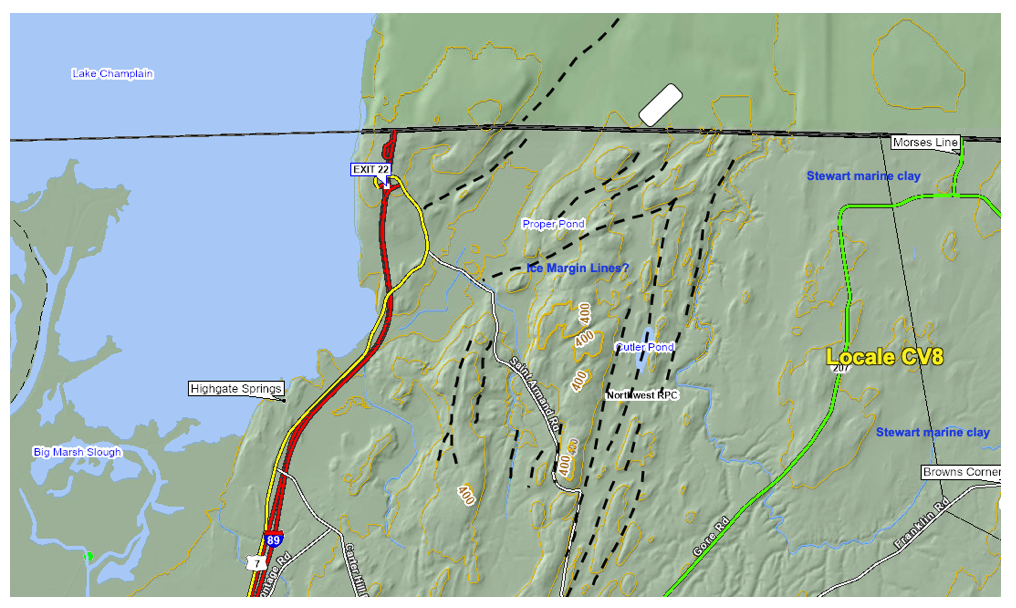 Ice Marginal Lines are also identified on the floor of the Missisquoi Basin near the Quebec border: