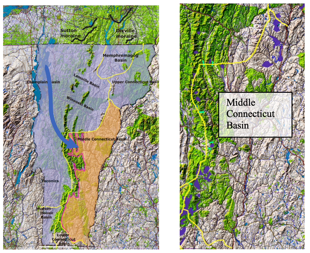 The map below right shows Scabby Terrain, as purple colored shading, along the western and northern perimeters of the Middle Connecticut Basin, marking the upgradient Disconnection locations in T2 time. Stagnation of the ice mass occurred in T2 time when the ice sheet level lowered to elevations where and when ice supply from the main Champlain Basin, as depicted schematically by the blue arrow to the Middle Connecticut Basin became interrupted. Whereas only one arrow is depicted, this pathway connection was via multiple low cols on the Green Mountain ridge line, as identified on VCGI, but not presentable here owing to scale limitations. The ice mass in the Middle Connecticut Basin was supplied by eastward ice flow from the Champlain Basin across cols and as well by southward ice flow pathways from the upper Winooski Basin via low terrain across divides. Some areas of Scabby Terrain patches are too small to be readily visible on this map.