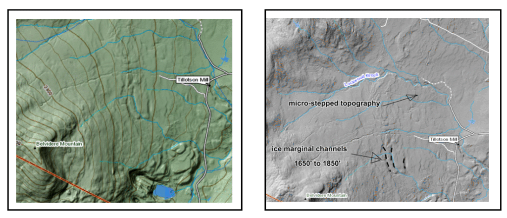 An example of Ice Margin Steps is on the east side of Belvidere Mountain, near an old asbestos mine identified as “Tillotsin Mill.” The screenshots below are from the VCGI base map with USGS topographic base map on the left and LiDAR imagery on the right. Of course, to be certain that the “micro-steps” are not reflecting bedrock structural grain would require field checking but seems unlikely.