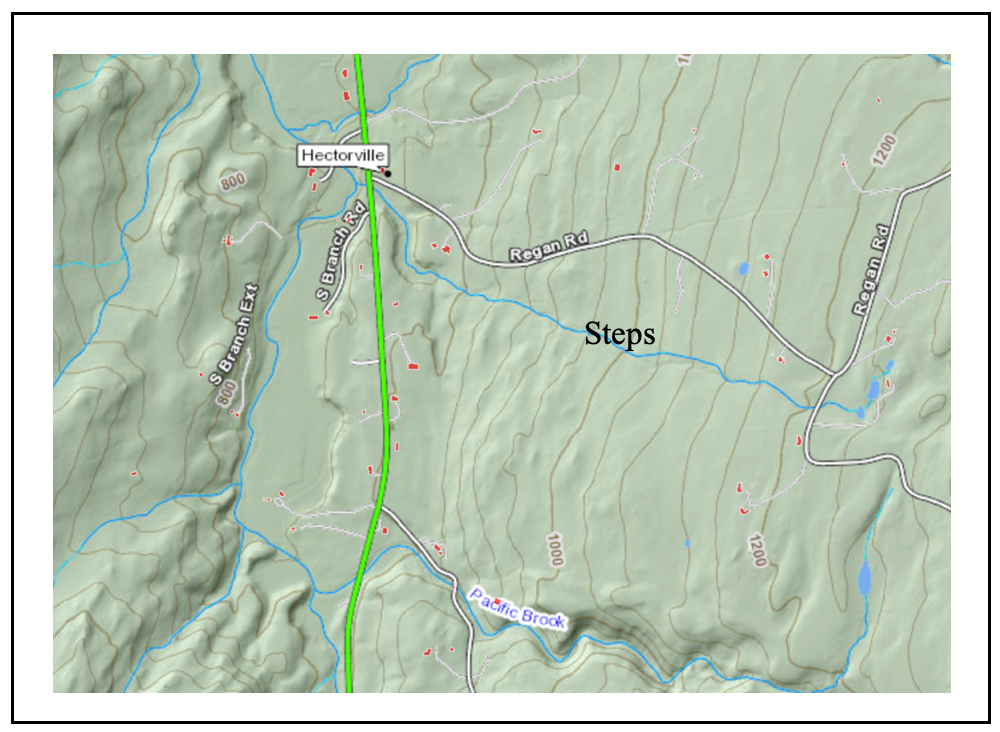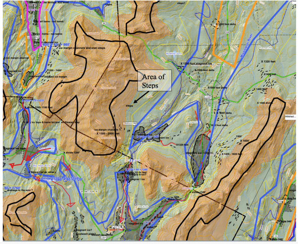 As can be seen the “Steps” are subparallel to the topographic contour, discontinuous, with step risers too small in height to be marked by topographic contours. Also shown are nearby Ice Marginal Channels, one of which diverts surface water drainage. It seems likely that Ice Marginal Channels and Steps are on a spectrum, perhaps with a related nature. Steps are believed to have formed at and near the ice sheet margin. They are predominantly in till, but whether or not granular soil material indicative of flowing water action in their formation is present is unknown. An alternative hypothesis is that the steps were formed by the weight of ice blocks near the ice margin. Clearly, detailed field work is needed to further assess their origin and significance.