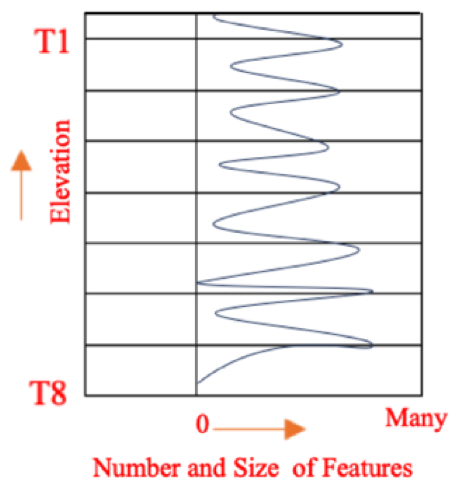 To move on to another important element about the ice margin database as mapped here, if one were to make a graphical plot of the number and size of ice margin features across their elevation ranges in Vermont, it would look something like the following schematic:
