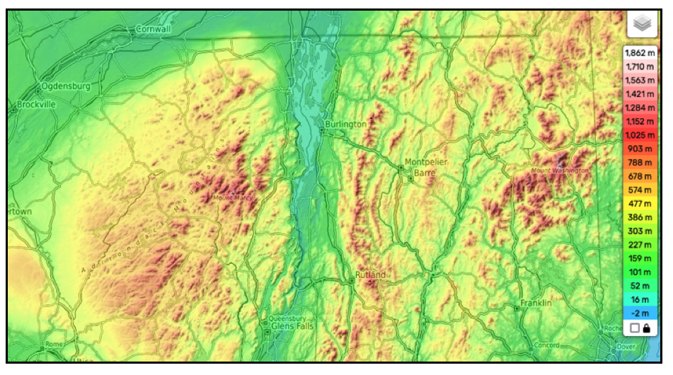 Assuming that local, Vermont scale hypsometry may be a contributing factor, a qualitative sense of Vermont hypsometry can be judged visually from present-day physiographic maps. For example, one of the previously presented physiographic maps is again shown below: