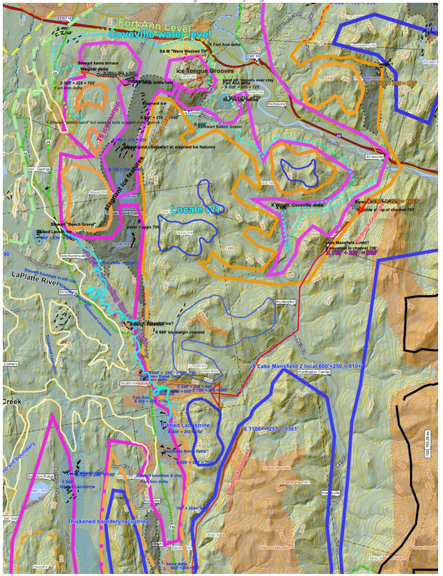 The subsequent opening of the Winooski Basin to Coveville Lake Vermont and the termination of Lake Mansfield, followed by the Fort Ann invasion and the development of Ice Tongue Grooves, and as well the development of a calving ice margin in the Middlebury Bench, are discussed in detail in the body of this report above.