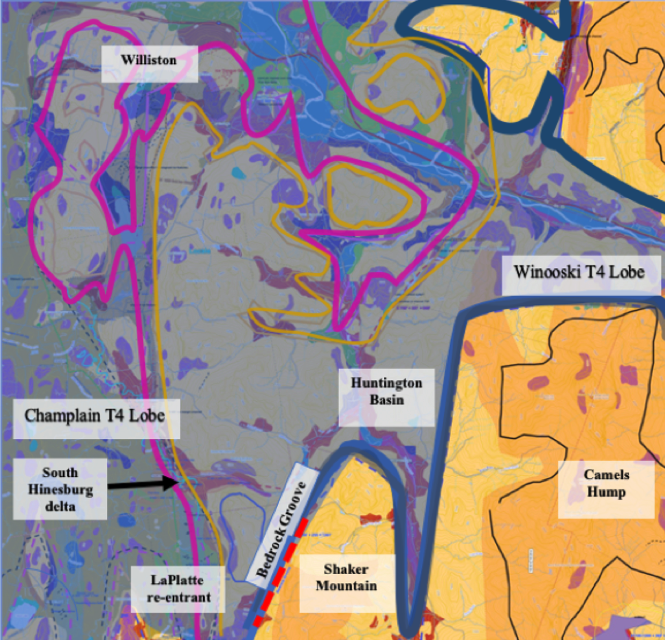 A sub-lobe developed in T4-T6 time in the LaPlatte re-entrant(located on the above map), with a T4-T6 stagnant ice deposit near Starksboro(immediately south of the map area), from which meltwater led to the formation of the Bristol delta in the narrow Lake Coveville “corridor”(also to the south and not shown). The South Hinesburg delta likely was also forming in T6 time, with Coveville penetration along and through the T4-T6 ice margin “corridor. ”