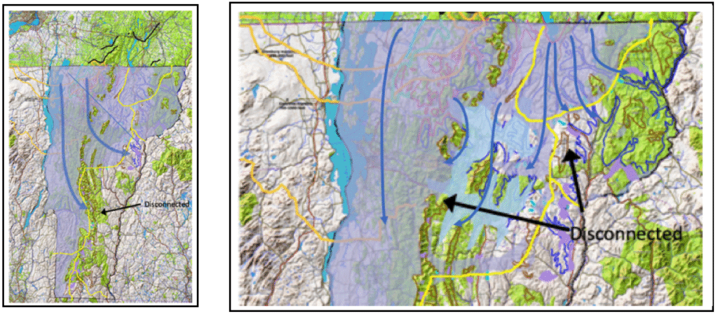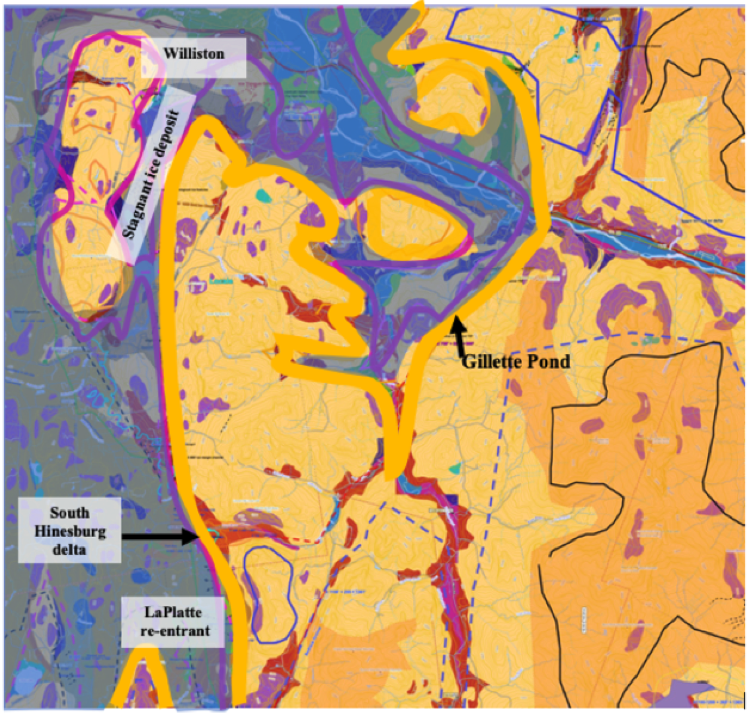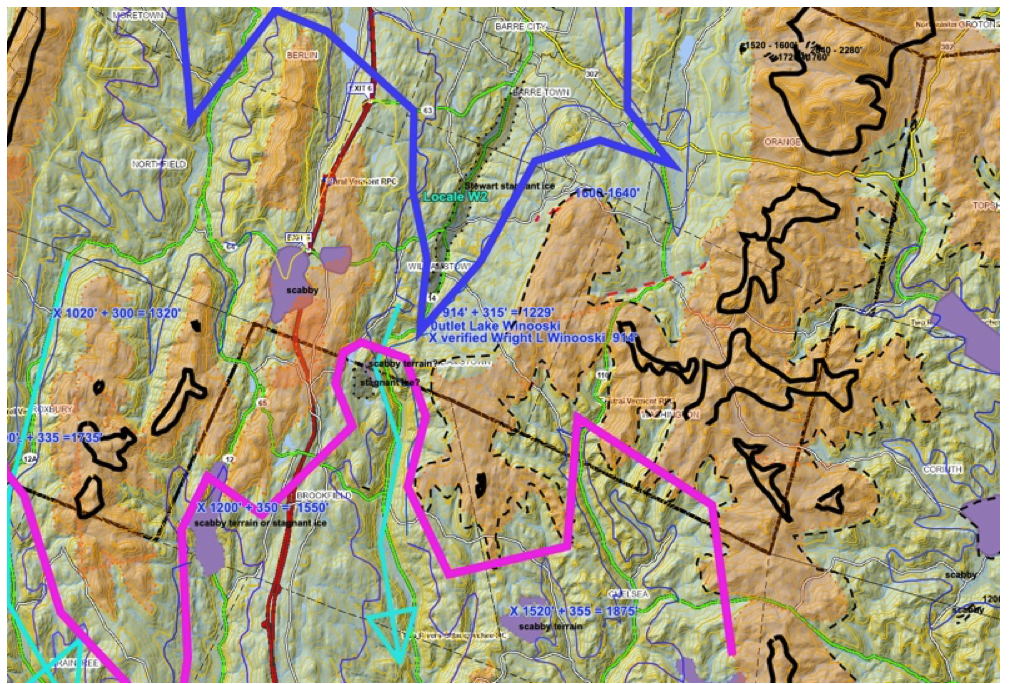 VCGI mapping provides evidence marking the receding ice margin of the ice mass in the Winooski Basin headwaters, including the Stevens Branch near the outlet prior to the development of Lake Winooski. The Winooski sublobe abutted against substantial upland terrain. For example, east of Marshfield