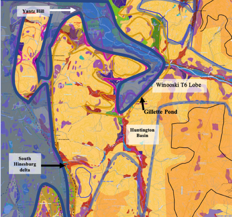 Immediately south of the Sabin Pond margin is a deltaic deposit(?), as indicated by the State Surficial map and topographic expression. LiDAR imagery indicates mining excavations at the head of the delta, which make geologic interpretation more difficult, but it appears that the esker feature represents a Drainage Line which grades into the deltaic deposit, which likely formed along the ice sheet margin, at an elevation corresponding with Wright’s Lake Winooski. Downgradient from this deltaic deposit to the south, the State Surficial Map shows the presence of lacustrine deposits. Thus, meltwater drainage from stagnant ice in the Sabin Pond area served to feed the Winooski level delta when the area to the south was ice free. This is a significant observation as it indicates that when Lake Winooski developed in T4 time stagnant ice remained along and just above its perimeter. This fits with the progressive recession of the ice sheet, water penetration along its margin, and the long-lasting presence of ice masses left behind, as part of the “hybrid” and “Everything, Everywhere, All at Once and Continuing” Style.