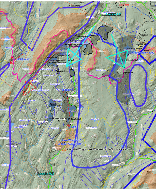 The heavy maroon colored line on the above screenshot represents the T2 ice margin(not the T6 margin which elsewhere is also marked by a maroon colored line) associated with the previously described Disconnection of ice mass in the Middle Connecticut Basin. Drainage from Lake Winooski was across the divide between the Winooski and Connecticut Basins. However, this drainage, including into the residual Disconnected ice mass area, has not been studied here.