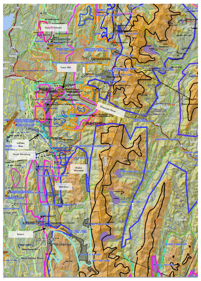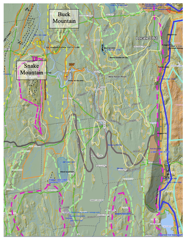 - The gray colored area, south of Williston, is a major stagnant ice deposit. This deposit includes remarkable LiDAR stagnant ice patterns ( these features in the field are also remarkable) and an associated esker, indicating progressive ice margin recession and substantial drainage to the south from the Winooski Basin via the Muddy Brook Basin, across a divide into the LaPlatte Basin in T6 time, at first into Coveville and then Fort Ann waters in the LaPlatte Basin, and as well a later and younger phase of drainage westward into the Sucker Brook Basin, south of Oak Hill, again first into Coveville and then Fort Ann waters. Field examination of this area in the 1960s and again in 2024 document the presence of substantial, strong stagnant ice deposits.