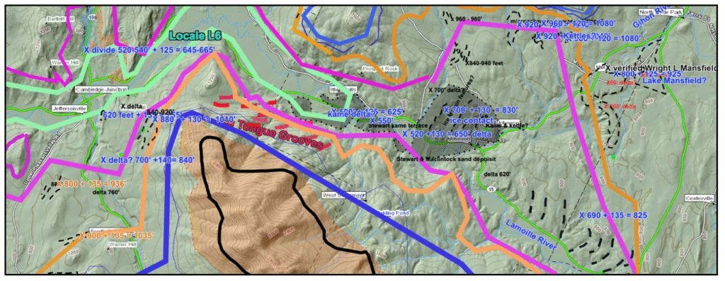 As discussed below in the section of this report dealing with deglacial history, without delving into details here, the margin of the Champlain lobe stood at the mouth of the Lamoille and along the foothills to the north and south, as marked by the blue line T4 ice margin, the orange line T 5 ice margin, the maroon line T6 ice margin, and the sage colored T7 ice margin. These ice margins correspond with numerous ice margin features both to the north and south along the foothills, and as well within the ice tongue in the Lamoille Basin, again marking the progressive step-down recession of the ice sheet in the main basin and the Lamoille basin. As can be seen, Ice Tongue Grooves descend from the T4 margin high on the hillside to the T7 ice margin on the Lamoille Basin floor in close association with a substantial kame delta deposit at the Fort Ann level on the basin floor, likewise with ice margin recessional markings.
