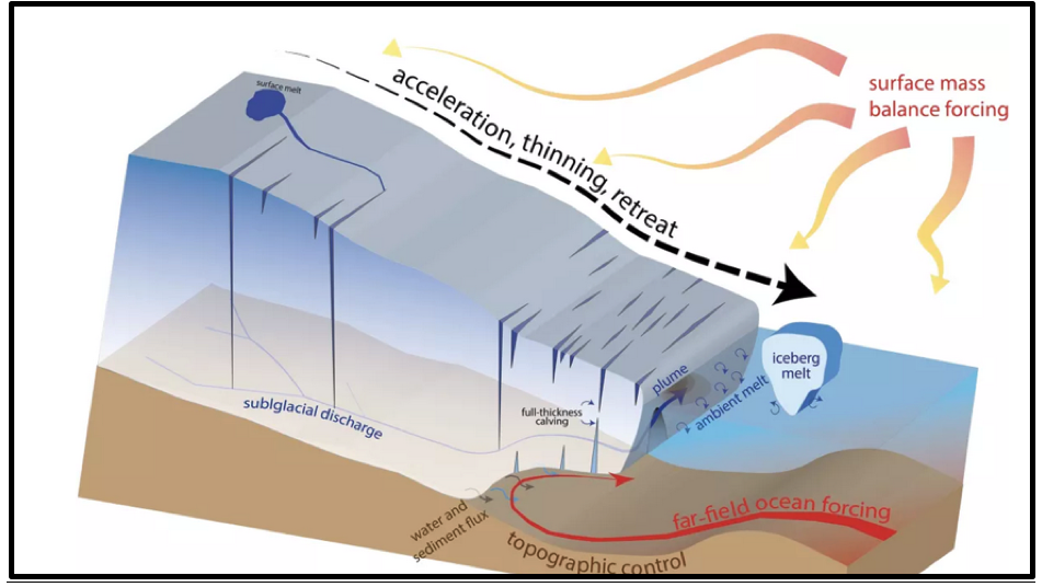 This deglacial history likely provides important information bearing on present day global warming, in particular for the Greenland Ice sheet and other ice caps and glaciers, as discussed elsewhere herein. The coalescing and sudden water level lowerings associated with the step-down recession of the Champlain lobe affected the Glacial Dynamics of the Champlain lobe, including: