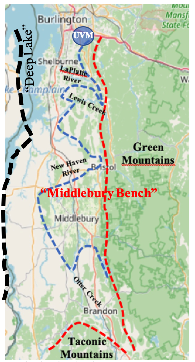 Starting from the University of Vermont (UVM), which sits on a hilltop on the Champlain Basin floor in Burlington (near the northern margin of the “Middlebury Bench” which is more substantially south of the Shelburne vicinity), the traveler can look westward to see the lowland of the Champlain Basin with present day Lake Champlain on the floor of the Basin, northward and see the lower terrain of the Winooski Valley, eastward to the opening of the Winooski Basin in the foothills with the Green Mountains as a backdrop, and southward and see the continuing hilly terrain of the Middlebury Bench on the Champlain Basin floor.