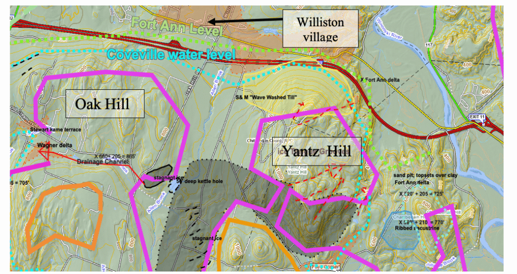 - On the northwest flank of Oak Hill the dotted bright blue Coveville margin and dotted bright green Fort Ann lines on the above map are interpreted as marking the receding ice margin and narrow labyrinthian Lake Vermont semi-open water Disaggregated corridor between the higher terrain and the ice margin. The ice margin recession occurred in step-down progression from slightly above the Coveville level to slightly below the Fort Ann level, from the late T6 to early T7 levels and times. These strandlines are believed to represent the progressive northward encroachment and advance of Coveville and Fort Ann waters along the receding ice margin into the Winooski Basin.