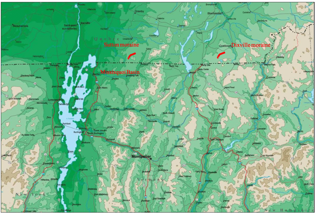 This map shows the approximate locations of the Missisquoi Basin and the Dixville and Sutton moraines in Quebec, as mapped by Parent et Occhietti and others. 1The Sutton moraine as mapped by Parent et Ochietti extends across the Pike Basin, in Quebec, near Sutton, and is not shown as extending southward in the Pike Basin. However, it seems reasonable to presume that the receding ice margin extended southward in this basin. The interpretation given here in fact suggests such an interpretation. However, as was common throughout Vermont, the receding ice margin was a step-down type such that it is possible that both interpretations are compatible. As indicated, the Dixville moraine is correlated with the T4 ice margin and the T6 ice margin with the Sutton moraine in Quebec. The evidence in the Missisquoi Basin indicates that the T4 – T8 ice margins were in a step-down sequence, which, as repeatedly stated for many locations throughout the State can be likened to the rings on a slowly draining “Bath Tub.” The T7 margin was associated with Fort Ann Lake Vermont and the T8 margin with the Champlain Sea.