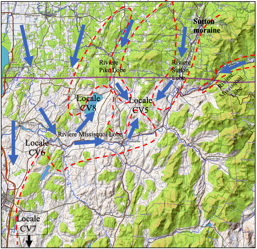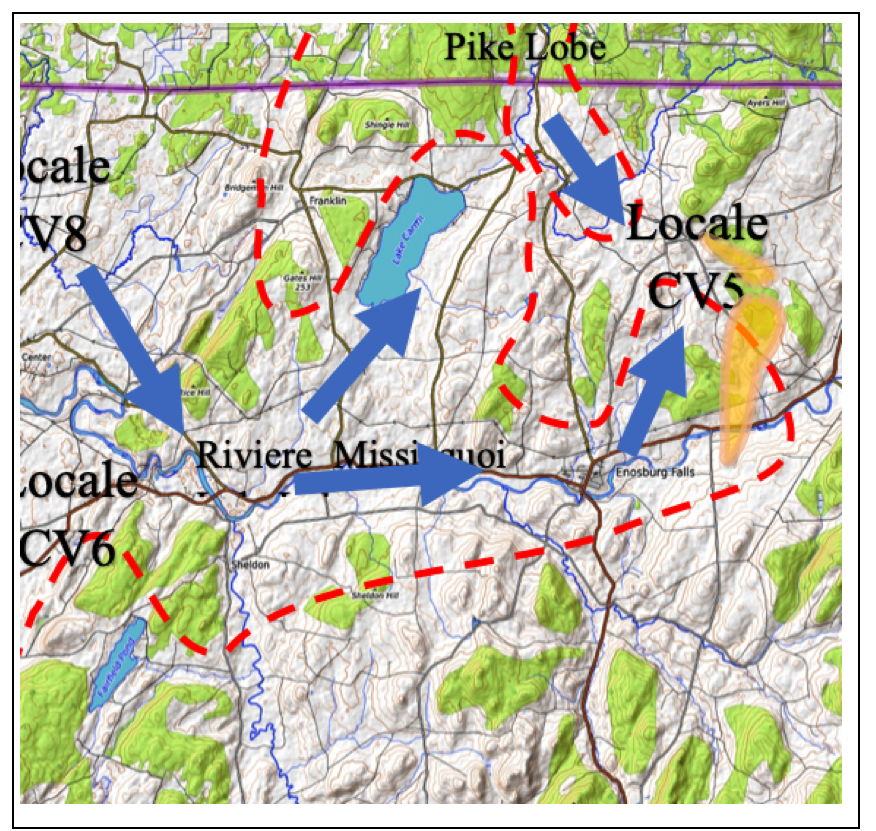 This Locale is in the northwestern corner of Vermont where the T8 ice margin marks the Champlain Lobe which lies against and on the west side of a low relief but nevertheless prominent bedrock prong extending southwesterly from Quebec into the Missisquoi Basin. Within the Missisquoi Basin, as indicated by VCGI mapping, this Missisquoi sub-lobe extended up basin into the Lake Carmi sub-sub-basin, continuing northeastward where this sub-lobe joined with the Rivier Pike lobe which extended southwestward to the Berkshire area which was previously described as part of Locale CV5.