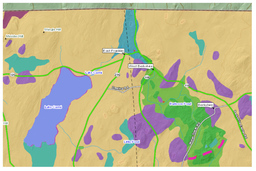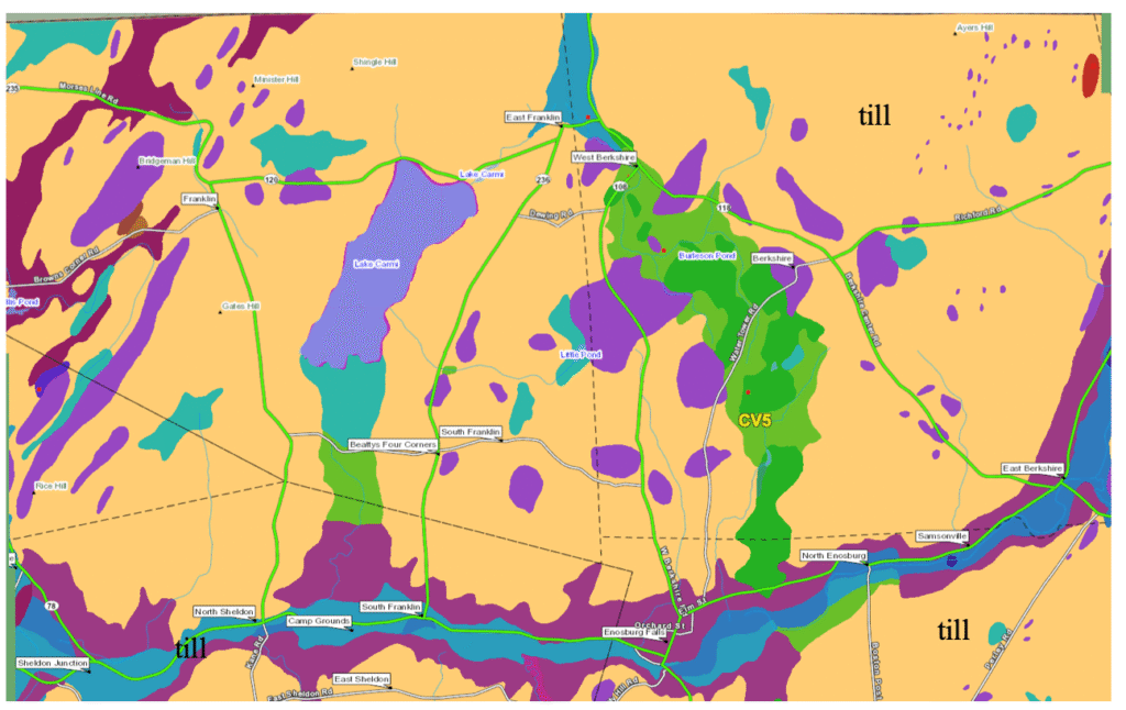 The Canadian border extends across the northern portion where VCGI coverage ends. Whereas the trace of the Missisquoi River per se is not visible at this scale, the present day floor of the lower Missisquoi Basin extends across the area in the vicinities of the villages of Sheldon Junction, South Franklin, Enosburg Falls, and East Berkshire, along the south side of the above map. The cobalt blue areas represent post-glacial alluvium. The light ochre color represents glacial till, which occurs as a thin ground moraine veneer over shallow bedrock in the low relief landscape in the lower Missisquoi Basin. The purple colored unit represents fine-grained, non-bouldery, ponded water sediment.