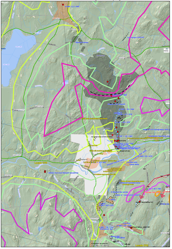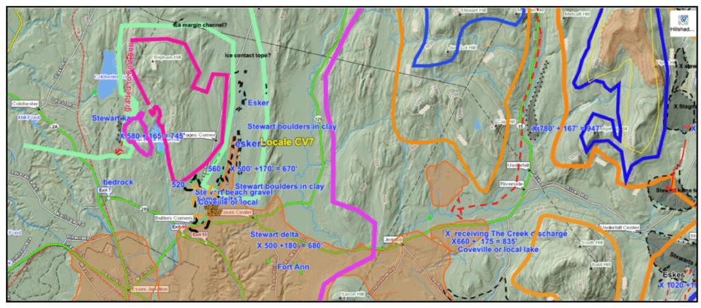 In the vicinity of Locale CV5, basically in the saddle in the above topographic prong, are two green colored units; the darker green colored unit is identified on the State map as “Isolated kames”, and the lighter green colored unit as “Lake Sand.” Also included within this kamic area is a feature mapped as “esker.” LiDAR and topographic imagery suggests that the “esker” extends further south, in an area mapped as isolated kame. Elevations of the “esker” crest generally slope southward, suggesting southward drainage in an ice lobe in Locale CV5. Immediately south of this esker extension is a terrace remnant which Stewart and MacClintock mapped as the dark purple unit identified as silt, silty clay, and clay. However, the sewage favorability tab indicates well-drained, sandy soil, probably a small Champlain Sea deltaic terrace remnant. In essence, the “esker” deposit appears to grade into the deltaic feature, which suggests deposition of the esker feature in Champlain Sea time.