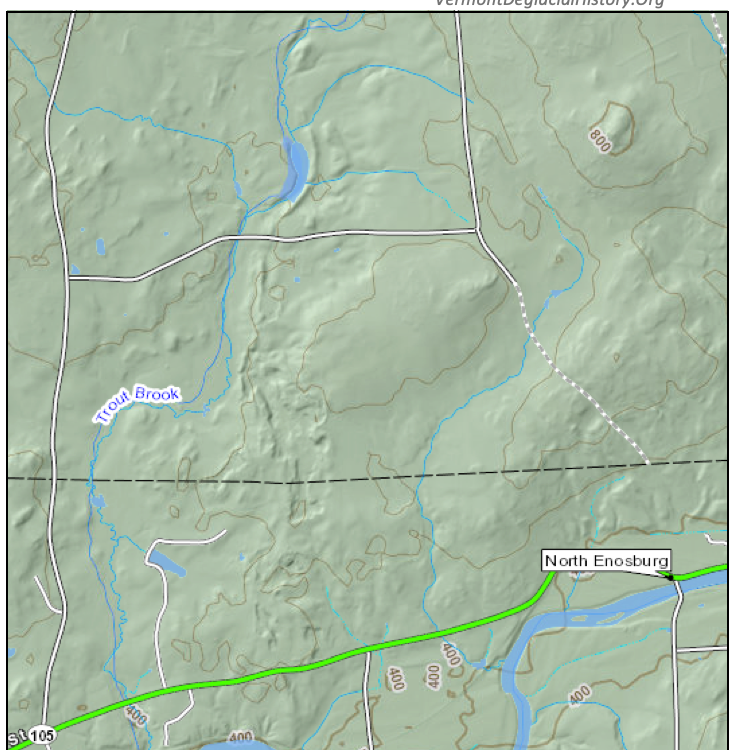 - The appearance of the terrain near Enosburg Falls and elsewhere on the north side of the Missisquoi Basin in places has a striking appearance of a fresh, young looking, bouldery ground moraine. This may be a mappable feature, but to date such mapping has not been attempted. Also, LiDAR imagery of this feature shows a distinctive signal. Such ground moraine is very different from that seen elsewhere in Vermont, where ground moraine generally has been modified by the effects of proglacial standing water following ice margin recession.