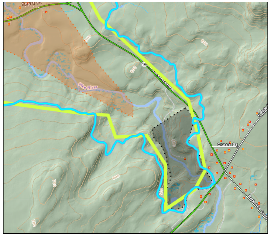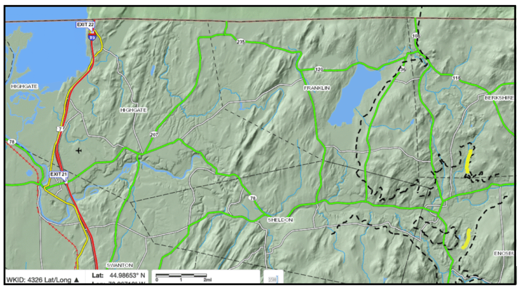 The following screen shot is from a VCGI map of a larger portion of the Missisquoi Basin, including areas both to the north and south of the Missisquoi River, with the black dashed line marking the 520 foot(158 m) contour: