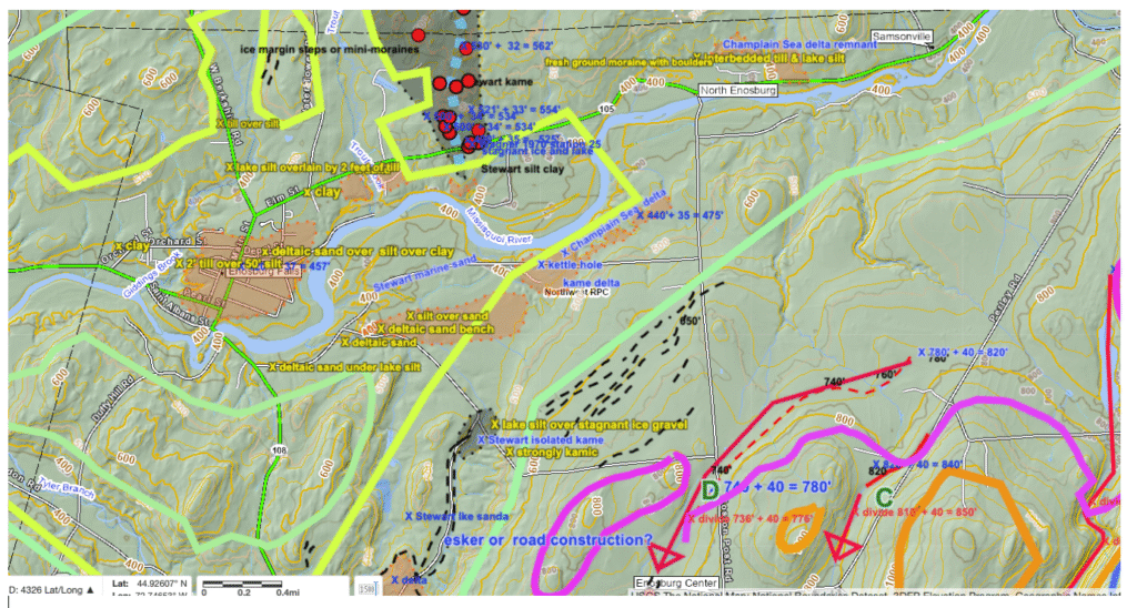 The kamic ridge has a flat top surface, which slopes northeastward and grades into terrace deposits extending a short distance down Sweet Hollow. Multiple fluvial surface terrace remnants are evident further downgradient in the Hollow, above a surprisingly and curiously broad, flat, and sharp-edged valley floor. Near the mouth of Sweet Hollow, which opens into the Missisquoi Valley lowland, are deltaic deposits which are extensive in this part of the Valley at the Champlain Sea level. The State Surficial map shows a “marine sand” deposit extending up into Sweet Hollow, suggestive of drainage down Sweet Hollow, and likewise other neighboring drainage ways marked as Ice Terminous Grooves on VCGI are graded to Champlain Sea deltaic deposits The upper surfaces of the kamic ridge, and the immediately adjacent terrace, may be correlative with terrace remnants further down the Hollow, and in turn with a Champlain Sea deposits. At this point, however, the correlation of the kame and kettle feature at the head of the Hollow via terraces in this drainageway to the deltaic deposits is uncertain and needs more careful study.