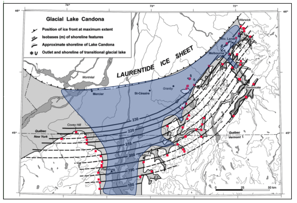 As reported by the authors, the above map is based on shoreline features as shown in an earlier 1988 report(Figure 7), marked on the above map as red dots. This shows that the delineation of Lake Fort Ann(Candona) is based on a small number of shoreline features in Vermont, and that the position of the ice margin per se in Quebec in Fort Ann time apparently is not documented.