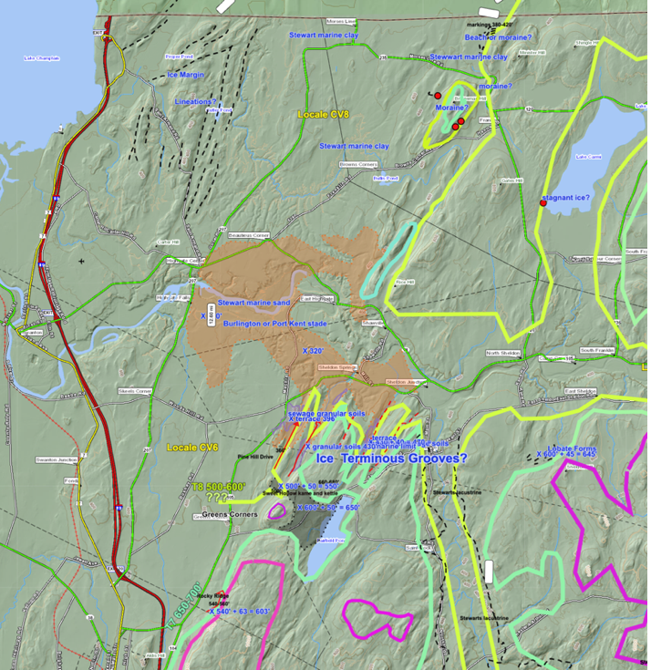 Locale CV5 is quite significant as it documents complex but important elements of the deglacial history, including the Champlain Sea invasion and its close association with the ice margin. Locale CV6 likewise is significant. It was part of Wagner 2023 Open Letter, which is given in Appendix 5 in its entirety. Locale CV6 is located at the mouth of the Missisquoi Basin at the western margin of the foothills near St. Albans and Greens Corners, where Ice Tongue Grooves have been identified, similar to those marked at the mouths of the Lamoille and Winooski Basins on VCGI. As discussed previously, these features represent destabilization of the ice margin whereby the eastern margin of the Champlain lobe became transformed from a lateral to a frontal margin. As discussed in the Open Letter, these features include the Greens Corners area, showing the progressive, step-down recession, raising the possibility that this recession took place in the times of the Champlain Sea at its marine limit and possibly subsequently during its lower stades related to isostatic uplift. Intriguingly, Chapman’s depiction of the marine limit suggests a flattening of the marine limit strandline, perhaps a hinge line, but that is a different story that merits further study. It needs to be said that the elevation of the Champlain Sea at the marine limit and its well the lowering levels of the Champlain Sea are important elements of this history. The T8 margin as mapped here is believed to represent a readvance of the ice sheet in Champlain Sea time but after the initial time of the Sea incursion, as indicated by the mapping of till and silt-clay deposits on the surface of Champlain Sea deltas in the Miossisquoi Basin.