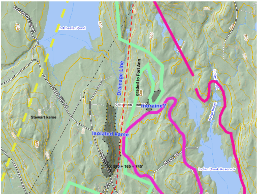 The feature identified as “Moraine?” on the above map consists of multiple prominent linear ridges. No exposures of the material composing the ridges were found. Many large erratic boulders are strewn on the surface of the ridges. However, possible bedrock exposures were also observed on the ridge indicating that the moraine-like ridge likely is not actually a moraine, at least in its entirety. The terrain in this area consists of multiple linear ridges, which likely are bedrock controlled, but part of the ice margin drainage similar to that associated with the Essex esker and the Colchester Pond Drainage Line as described above. Whereas the Essex esker seems to be related to the Fort Ann deltaic deposits at the mouth of the Winooski, the downgradient extent of the Colchester Pond and perhaps related drainage lines in the vicinity of the “moraine?” are uncertain and require further study.