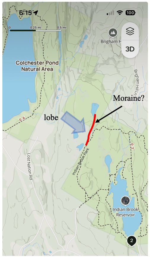 - Field reconnaissance in the area marked “moraine?” in 2024 and 2025 showed a strong linear topographic feature, located close to the western border of the Town of Essex Indian Brook Reservoir recreation area. The reservoir itself is man-made. The following is a map taken from an All Trails hiking app: