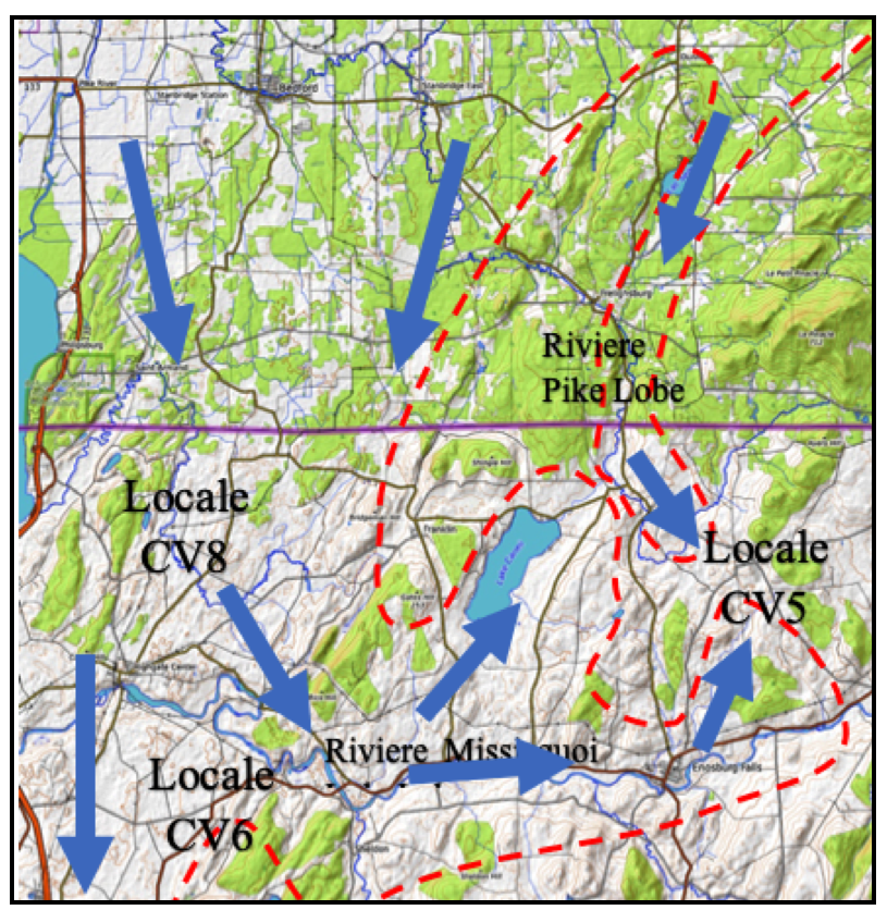 The T6 -T8 ice margins show that the Champlain lobe had four sub-lobe projections into the Missisquoi Basin, including the Riviere Sutton, Riviere Pike, and two Riviere Missisquoi sub-lobes, one from the main Champlain Basin to the west and one from the northeast. The Riviere Missisquoi sub-lobe pathway from the northeast extended westward down the Riviere Missisquoi basin following a tortuous, narrow pathway in mountainous terrain and likely was less well connected to the parent ice sheet than the other lobes. The Riviere Missisquoi sub-lobe which extended eastward up the Missisquoi Basin, subdivided further into a sub-sublobe, one extending northeastward via the Lake Carmi Basin and a sub-sublobe which continued eastward in the Basin. All of these lobes, sublobes, and sub-sublobes reflect the influence of the micro-physiography in this area, fundamentally as controlled by low bedrock relief.