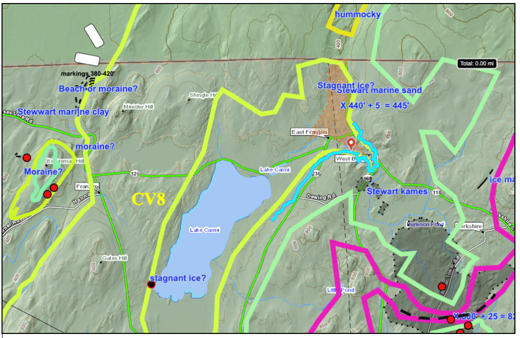 The delineation of ice margins in this area in accordance with the Bath Tub Model is an intriguing and challenging exercise, made all the more so by the low but irregular topographic relief in this area, combined with the need to bear in mind the presence of multiple lobes of the receding ice sheet which requires that the delineation makes geological sense in the context of ice margin recession. Different interpretive versions of ice margins in the Missisquoi Basin were developed as the VCGI mapping progressed. The delineation of ice margins as shown on VCGI in this Locale were purposely drawn with the above described physiography and likely multi-lobed front of the receding ice sheet in mind. In this context, the stagnant ice ridge at a crest elevation of 825 feet is interpreted as marking the juncture of the Riviere Missisquoi and the Riviere Pike sub-lobes, which of course are sub-lobes of the Champlain lobe. These sub-lobes followed the physiography, converging in a low saddle in the aforementioned bedrock ridge that extends southward toward Enosburg Falls from Ayers Hill and further to the north in Quebec.