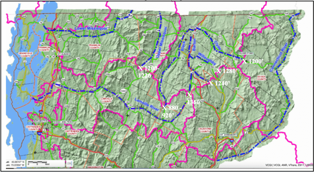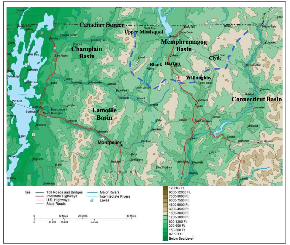 The following map is a VCGI base map, showing the major basin divides marked by purple colored lines for the five sub-basins, and the “local” elevations of divides for each col:3 Owing to the proximity of these divides to the Canadian Border, adjusted elevations are slightly higher than “local elevations.” for example the adjusted elevation of the Willoughby divide is increased from about 1280 feet to 1380 feet(390m to 421 m).