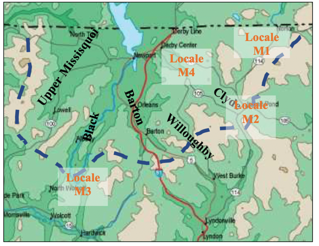 Multiple Locales are identified and discussed for the Memphremagog Basin. A discussion of these is made more difficult because of the complexity of local detail, all of which seems so interrelated as to make it challenging to distill this story in a simple, coherent way … reflecting a “hip bone is connected to the knee bone is connected to the shin bone” type of story for the recession of ice margins in this Basin. To assist the reader in both seeing the details and as well not becoming lost in the process, the following map, taken from above, shows the locations of Locales as discussed below: