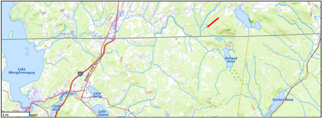 No definite, distinct, and substantial ridge-like morainic deposits mark the T4 margin on the Vermont side of the border. However, the LiDAR imagery shows a small, low, short, and thin ridge, as marked immediately west of Holland Pond. This ridge is about 50 feet(15 m) wide, with a height of about six feet. Whereas Franzi has identified morainic ridges in New York with similar LiDAR signatures(2024, personal communication), this feature in Vermont is of uncertain origin and likely is not an extension of the Dixville moraine.